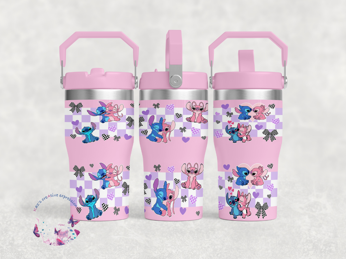 'Stitch & Angel Design' on our Pink Gloss Tumbler with flip top handle (colour in photo can often show different to actual product due to individual screen display differences).
