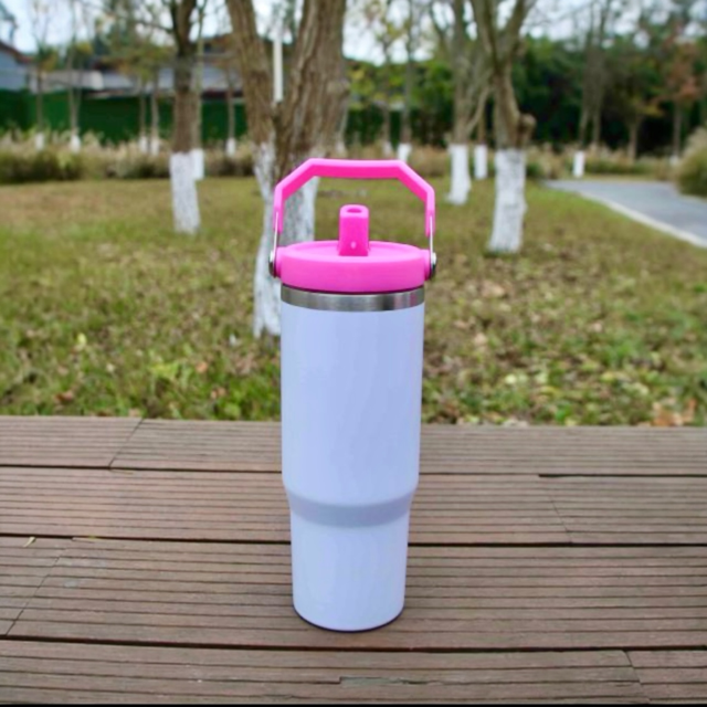 30oz (capacity) Insulated White Tumbler with Hot Pink Lid/Handle (colour in photo can often show different to actual product due to individual screen display differences).